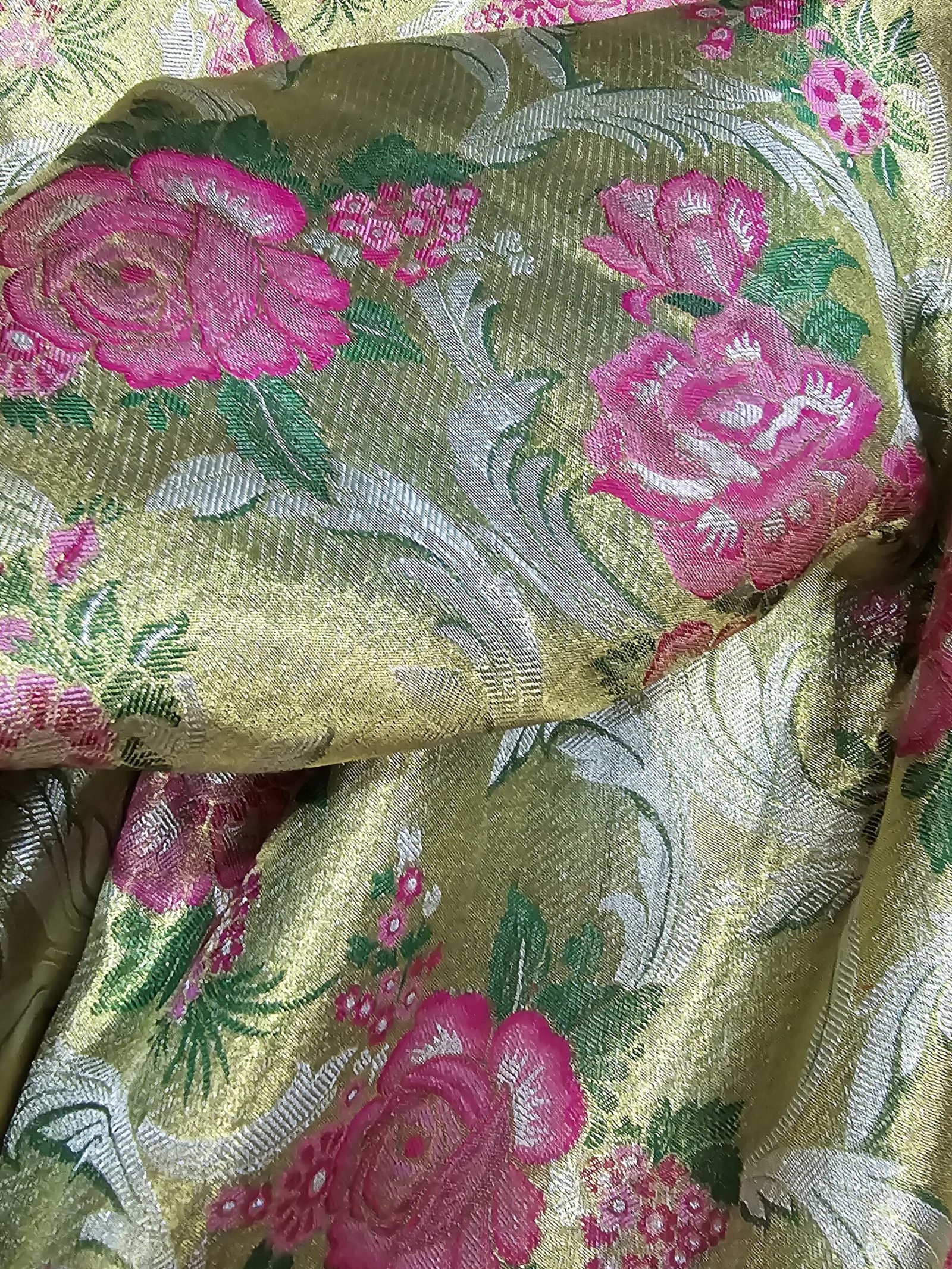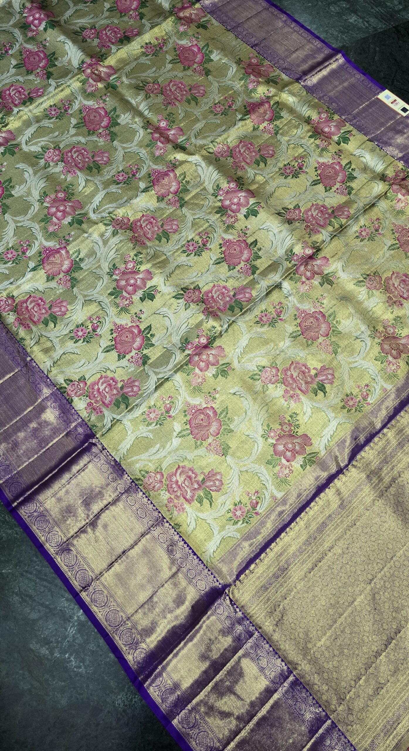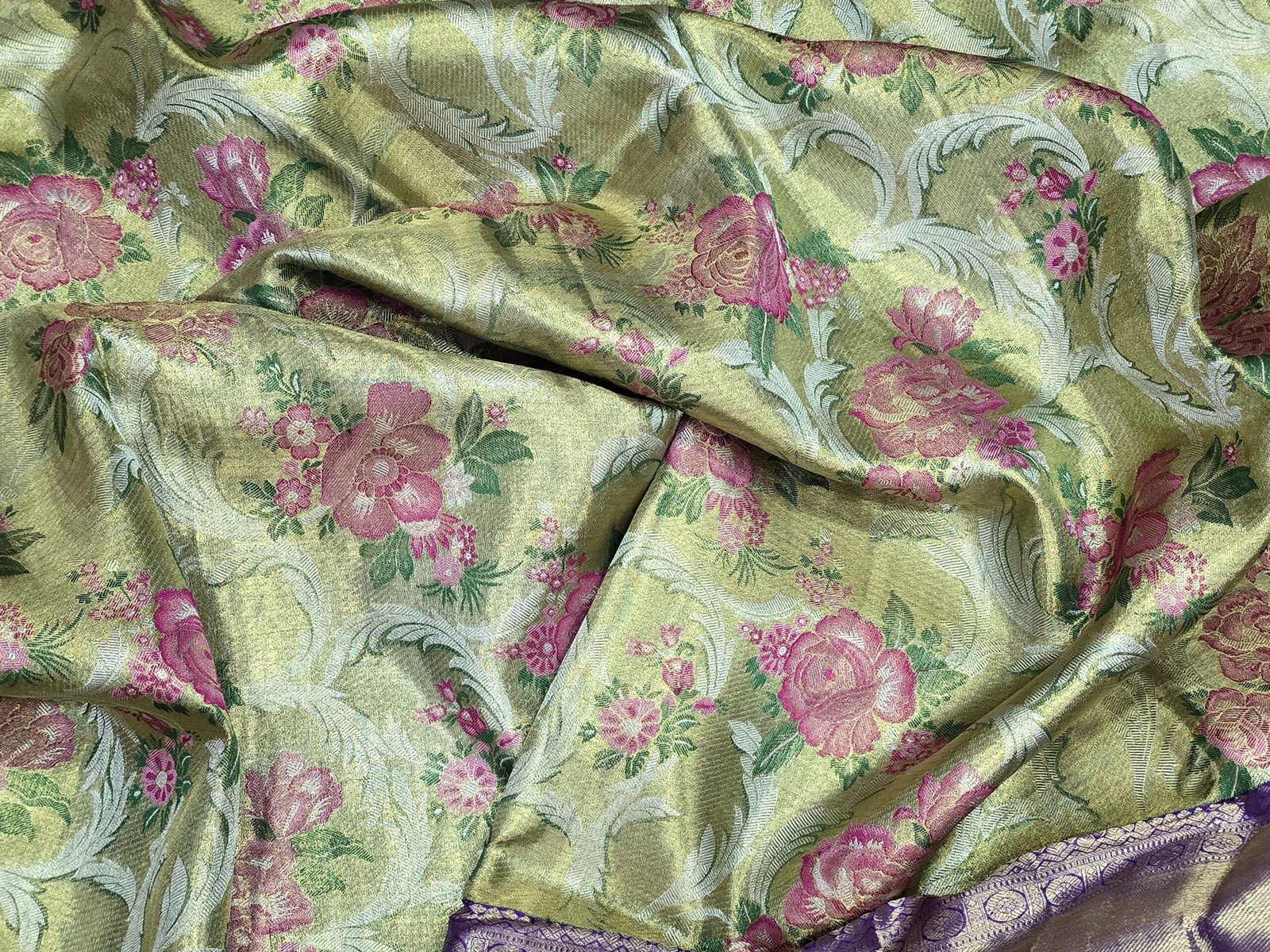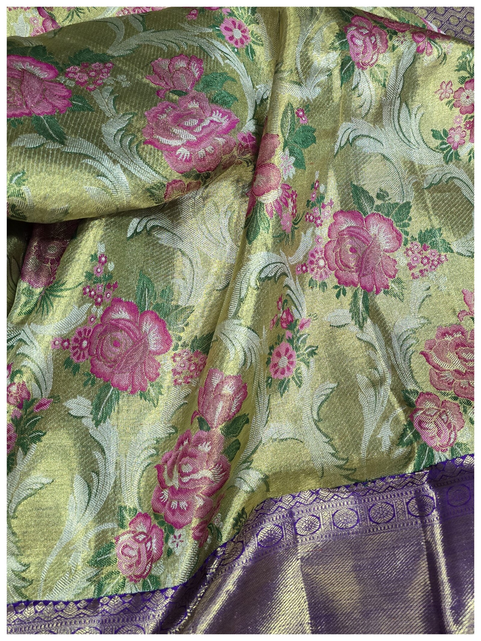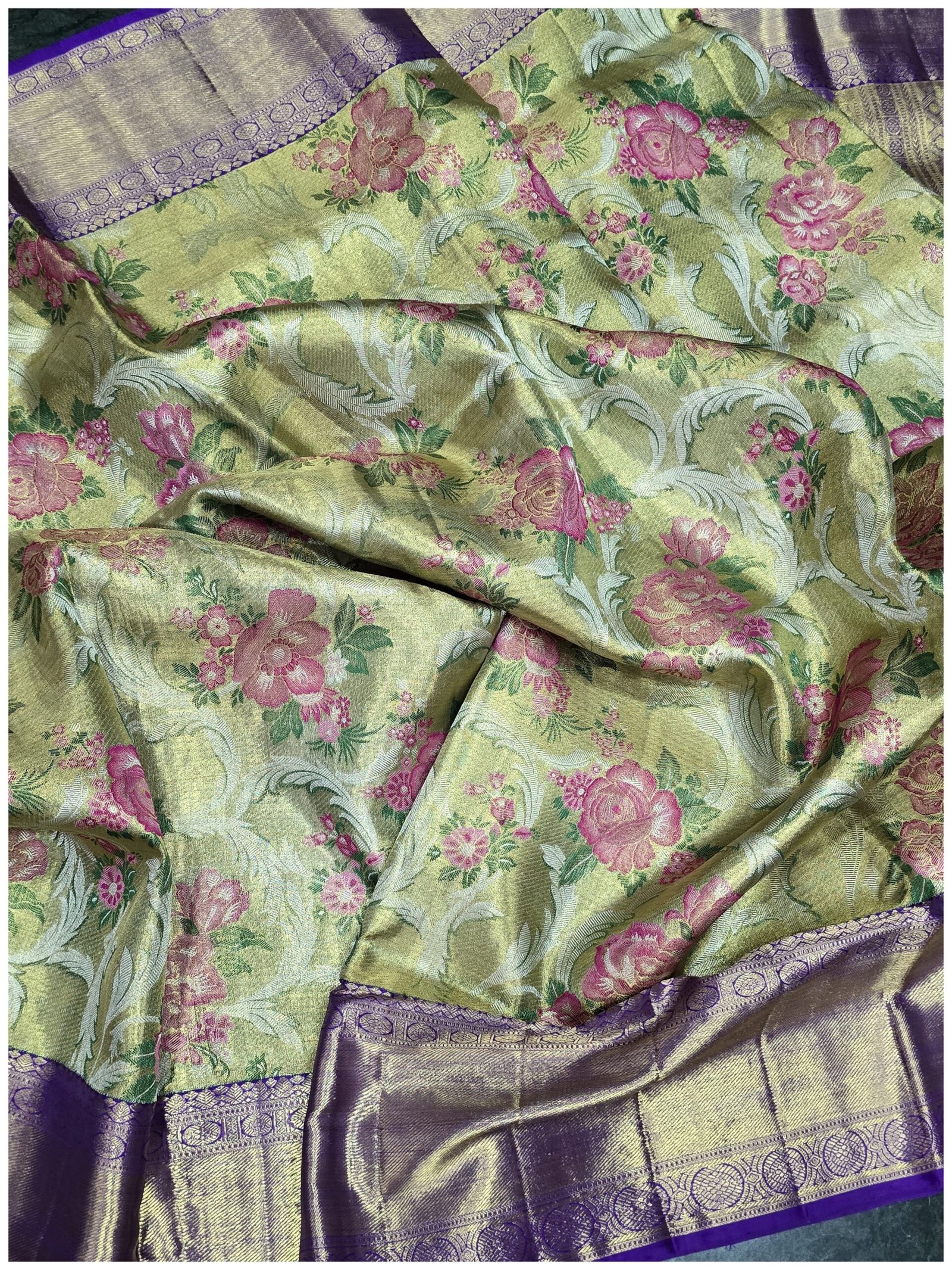 Handwoven Kanchipuram silk with meenakari jaal on the body of the saree .The saree as a subtle broacde and tissue finish